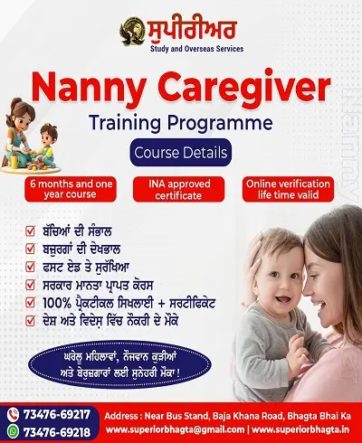 “We are proud to congratulate Rupinder Kaur on successfully completing her Nanny Caregiver Course with Superior Study and Overseas Services. Throughout her training, she showed dedication, discipline, and a strong commitment to learning. We appreciate her hard work and wish her great success in her future career. Well done, Rupinder!”